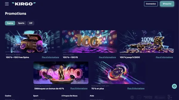 Nous gardons les promotions faciles à comprendre, avec des offres pour les nouveaux joueurs, des rechargements hebdomadaires et des tournois de machines à sous. La plupart des offres se réclament à la caisse, où vous pouvez aussi saisir un code promo lorsqu’il s’applique. Chaque offre affiche les conditions clés, y compris la mise (wagering) et les éventuelles limites de jeux. Si vous cherchez un bonus Kirgo, la page Promotions est le meilleur endroit pour vérifier ce qui est actif aujourd’hui.