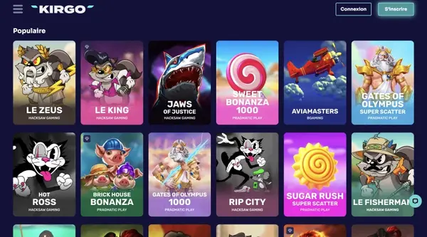 Nous proposons un grand lobby avec plus de 5000 titres, tout en l’organisant pour que vous trouviez rapidement ce que vous voulez. Les jeux Kirgo sont regroupés en catégories claires, avec des filtres par fournisseurs et fonctionnalités. Les machines à sous sont l’axe principal, mais vous pouvez aussi passer aux paris sportifs, au vidéo poker, au bingo, au keno, aux cartes à gratter, aux paris eSports et aux jeux crash. Pour les joueurs qui veulent du choix sans encombrement, les outils de recherche et de tri permettent de réduire la liste.